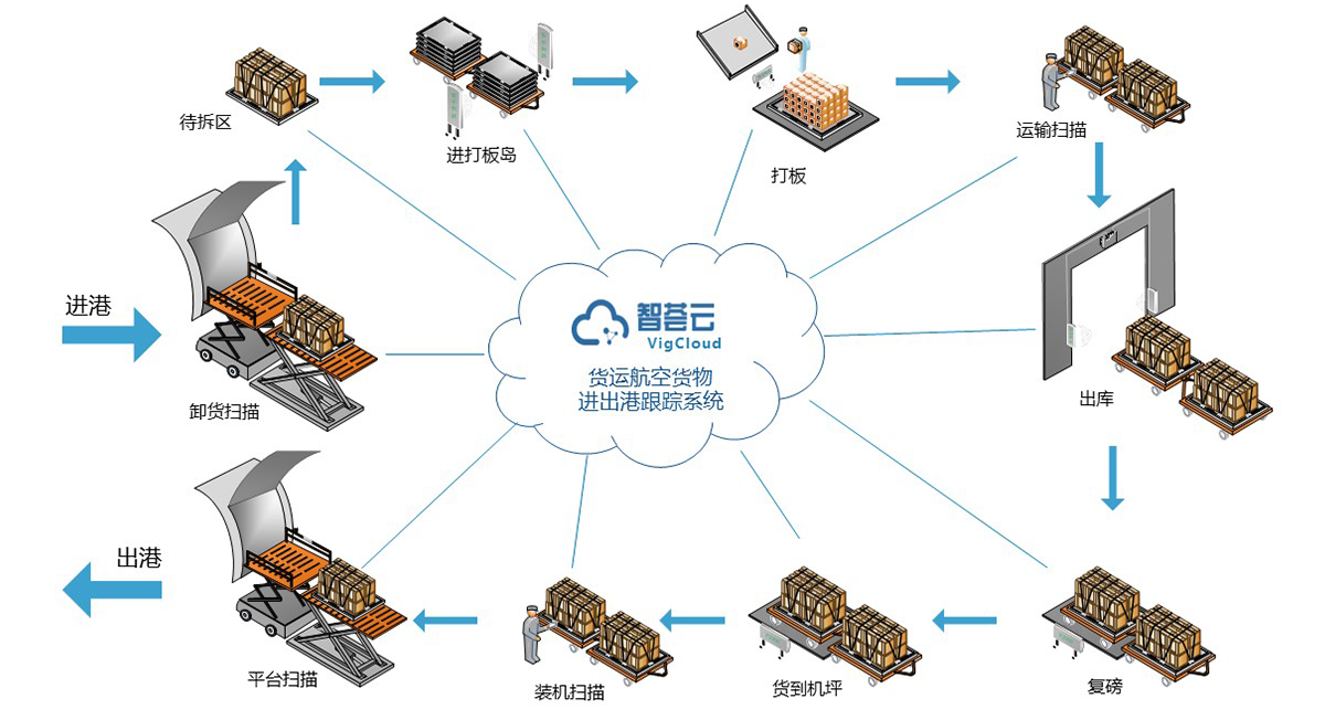 系统通过对航空集装板、航空集装箱上安装无源物联网RFID标签,通过读写设备以及激光雷达等软硬件系统实现对货物进出港作业环节的精准跟踪、降低作业差错,提升作业效率、有效管理航空容器资产的使用率,为航空货运提供智能化的数字管理
